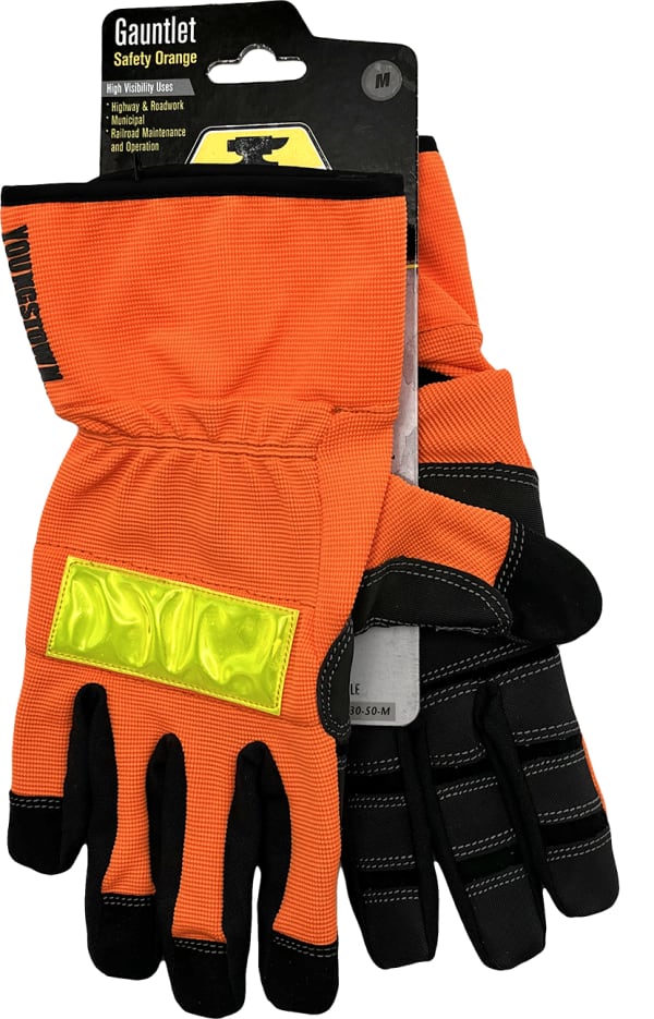 Youngstown safety orange gauntlet gloves. Hi-Vis with 3M Scotchlite reflective stripe on back. Reinforced palm & fingers. Extended cuff. Non-slip grip
