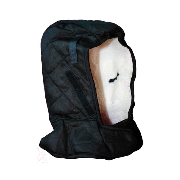 Sherpa Lined Long Neck Liner. Quilted black nylon outer. Helmet tabs. Hook and loop closure. Pockets for heat packs. Machine washable. Extra long length