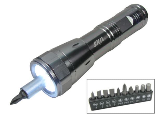 SKIL® Flashlight screwdriver. Bright LED Light surrounding a hex ratcheting driver. Comes with 10 screwdriver bits. Batteries not included.