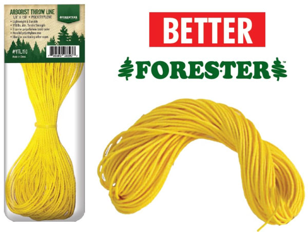 Forester Polyethylene 1/8” X 150’ Professional Arborist Throwline Parallel polyethylene core. Ideal for positioning other ropes. Less Memory. Lightweight & Durable. 190 lbs. Min. Tensile Strength 8 carrier polyethylene outer