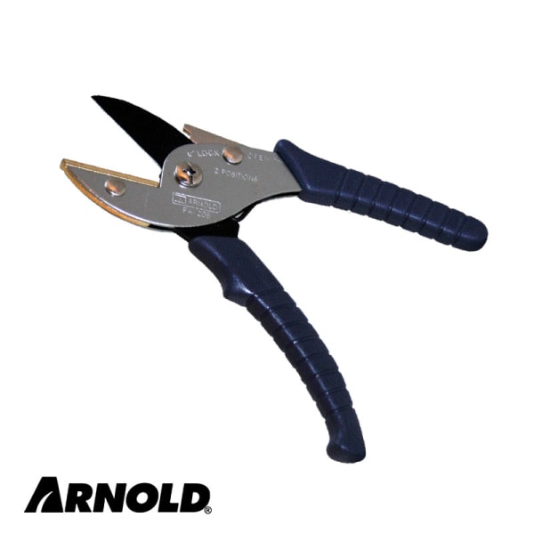 Arnold® Anvil Pruning Shears. Teflon coated blade w/ natural angle head. Versatile 2-position blade. Thumb operated lock. Contoured vinyl grips.