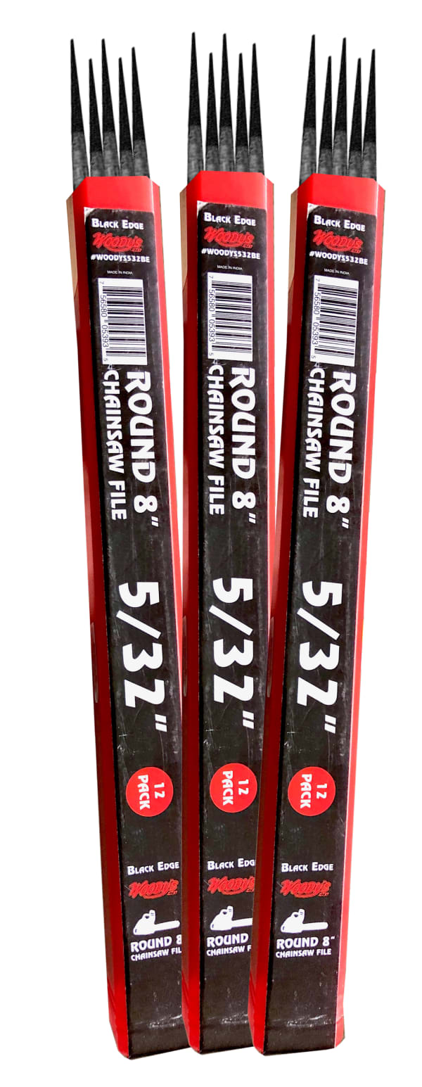 Woodys® Black Edge Round Chainsaw Files in Reusable Box. High quality round chainsaw files. Black chrome process that will add twice the life of a regular file. Black rust resistant finish. Competitively priced.